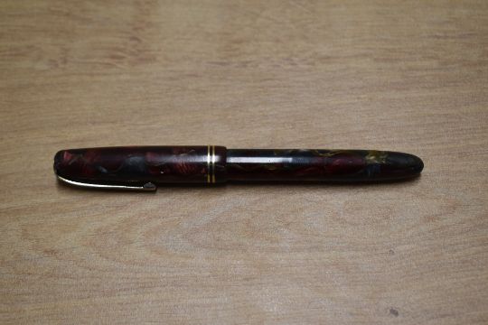 A Burnhan 55 lever fill fountain pen in Maroon and Grey Marble with two narrow cap bands having Burnham 14CT gold Super Quality nib. Good Imprint. Circa 1955