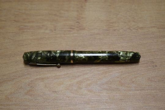 A Wahl Oxford lever fill fountain pen in Green Marble with single cap band having a Wahl 3 14k 0.585 Made in USA nib. Circa 1931