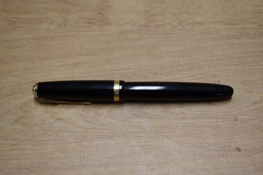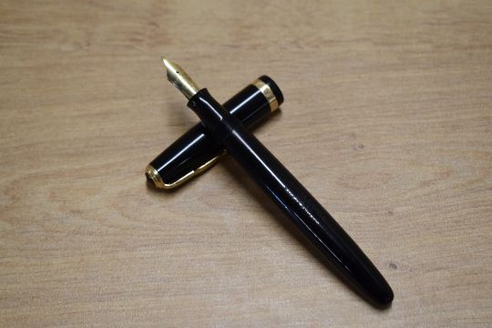 A Parker Duofold AF button fill fountain pen in Black with broad decorative cap band having Parker Duofold 14K Pen N nib. Circa 1946