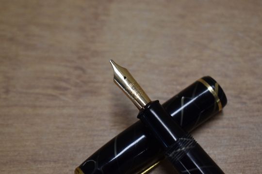 A boxed Conway Stewart 28 lever fill fountain pen in Black Cracked Ice with single narrow cap band having Conway Stewart 14CT Gold nib. Circa 1955. With original guarantee in box