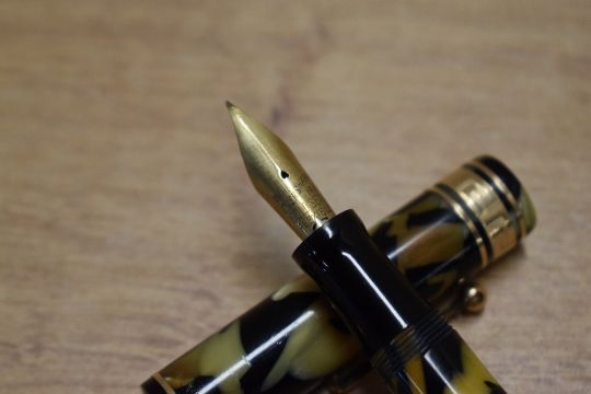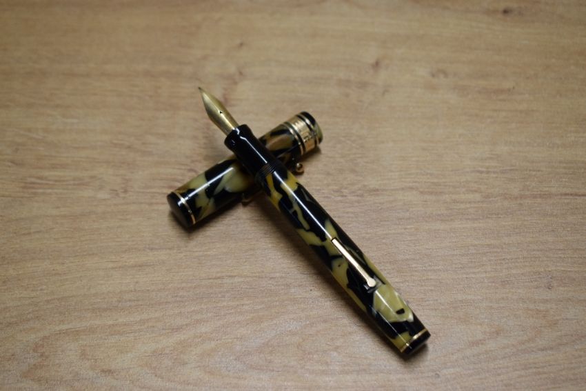 A Wahl Oversized lever fill fountain pen and propelling pencil in Pearl and Black with broad deco cap band having Wahl Eversharp 14K Gold Seal Flexible nib. Circa 1930. Both parts of set engraved with initials MSB