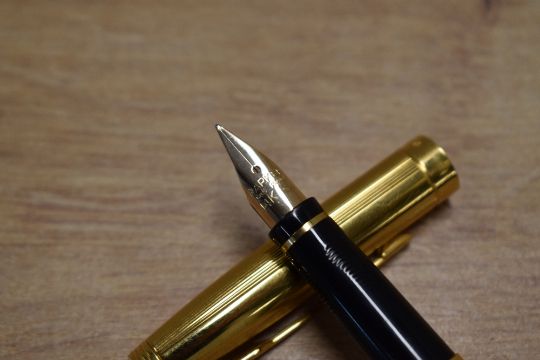 A Parker 75 Insignia converter fill fountain pen in Gold Plate having Parker 585 France 14K nib