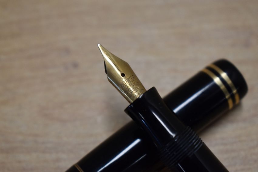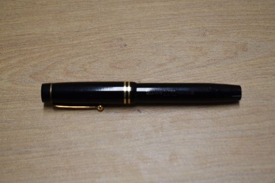 A Parker Duofold Junior button fill fountain pen in Black with two cap bands having Parker Duofold Pen Canada. Circa 1941