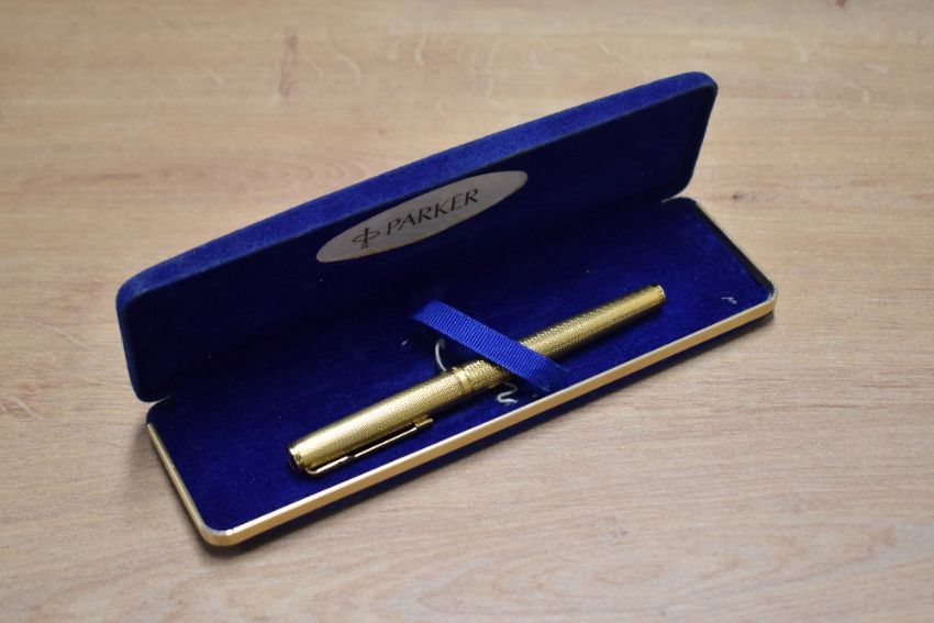 A boxed Parker Premier converter fill fountain pen in Gold Plate having Parker 750 France nib