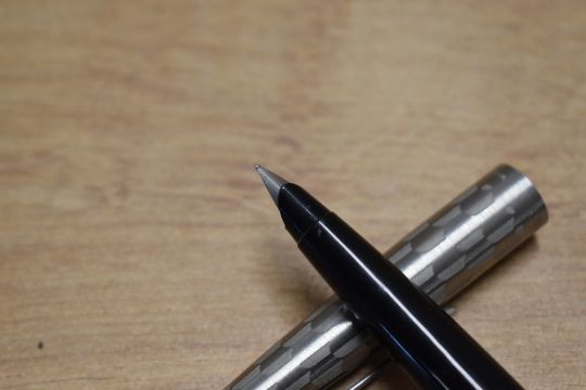 A boxed Parker 45 Harlequin cartridge converter fill fountain pen in stainless steel shield design