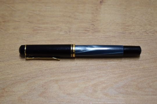 A Pelikan M200 piston fill fountain pen in Blue Marble with broad and narrow ca band having Pelikan M nib. Circa 1992
