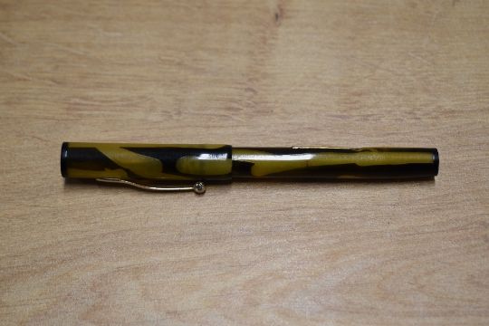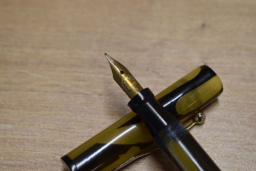 A Banker lever fill fountain pen in Green and Black having Banker 14K Gold Plated nib. Circa 1935.