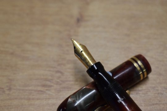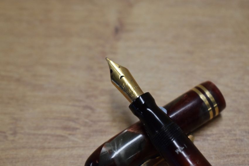A Conklin Endura Wordguage twist fill fountain pen in Green and Red Marble with two narrow cap bands having Conklin Toledo USA nib. Circa 1940. No seals fitted