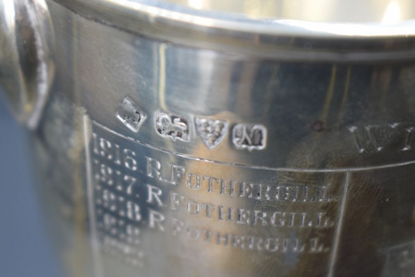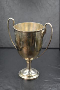 A George V silver trophy of traditional form, having scroll handles and personalised engraving 'Challenge Cup dated 1916-1920', raised on a circular step moulded foot, marks for Chester 1913, rubbed makers mark, 22.5cm, 396g