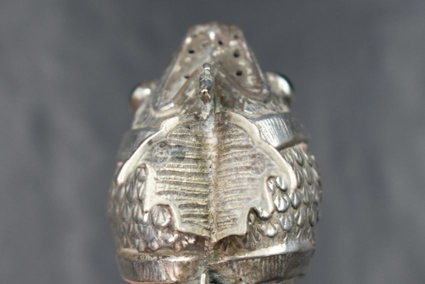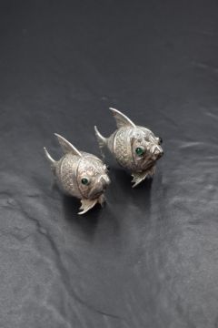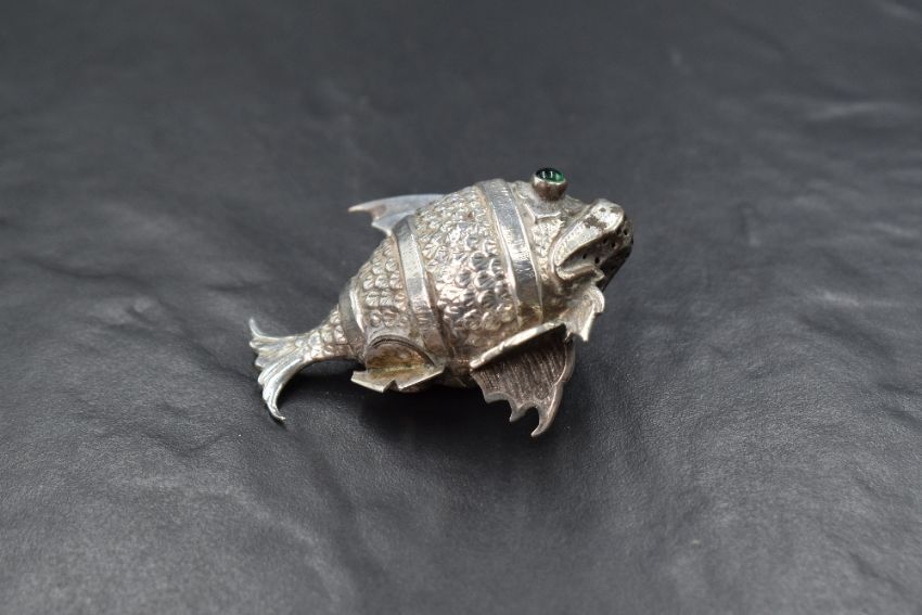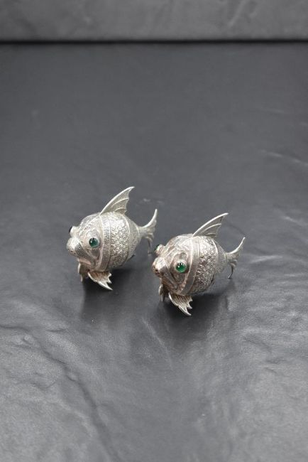 A pair of 20th century Spanish white metal 915. grade novelty salt and pepper, in the form of fish having green glass eyes, marked with a five point star, 40g gross