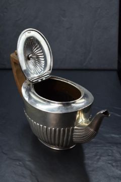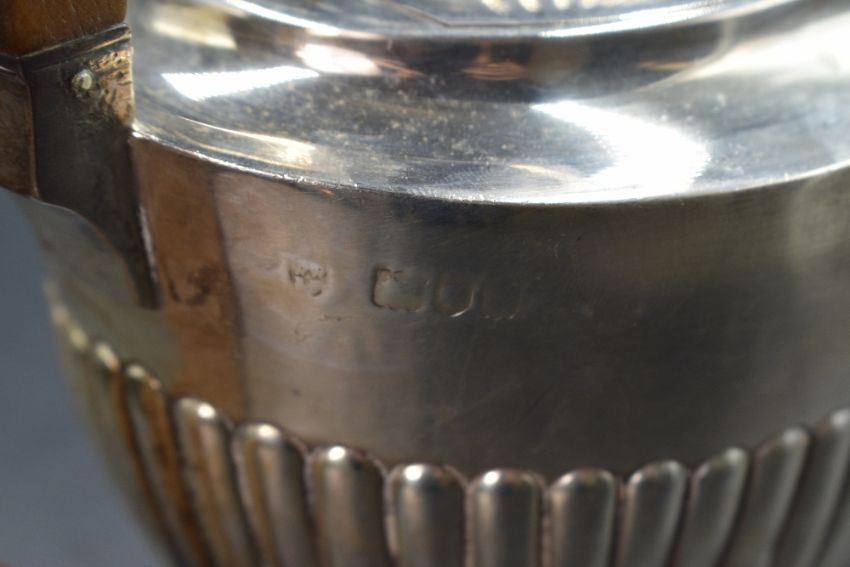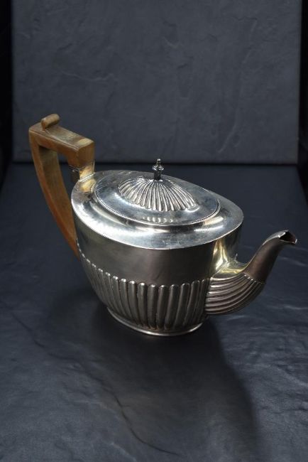 A Victorian silver teapot, of oval form having a half gadrooned body and angular handle, marks for London 1896, maker Charles Stuart Harris, 15cm, 469g