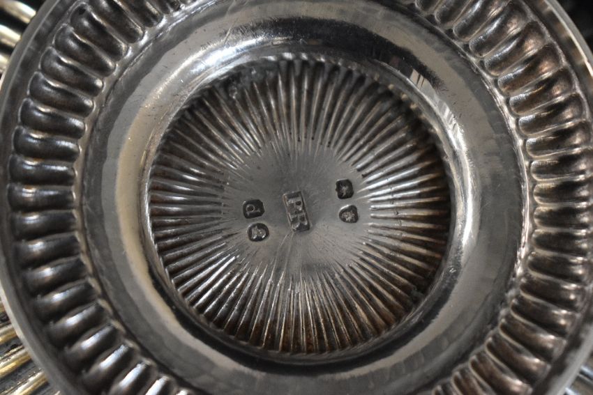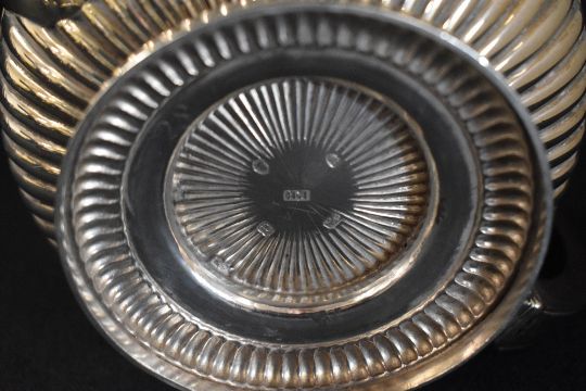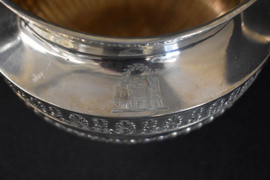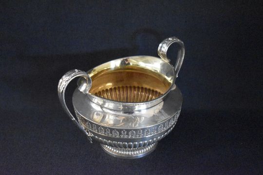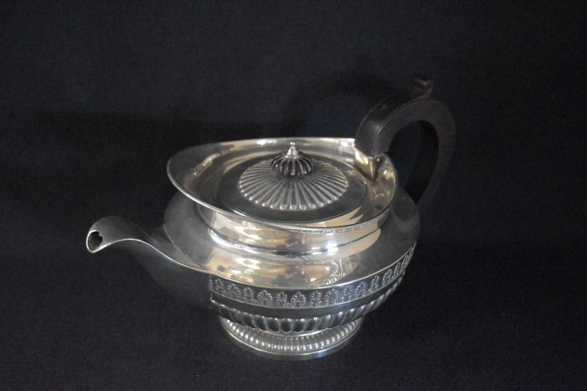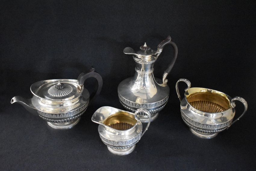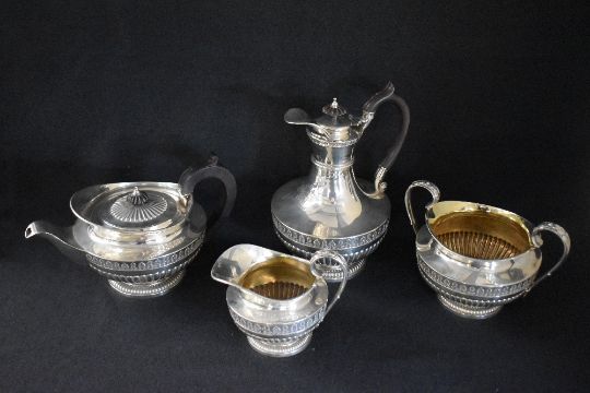 A late George III silver four piece tea set, comprising tea, coffee, sugar and cream, of bulbous form having decorative egg and dart style borders to rim, scroll handles, half gadrooned bodies and further scroll borders with a castle motif heraldic crest, raised on circular gadrooned feet, marks for London 1819, maker Philip Rundell, 2,926g gross