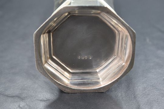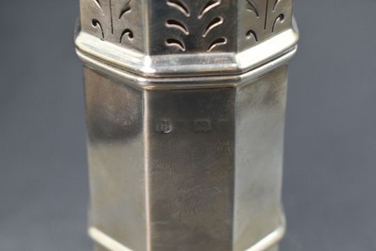 An early 20th century silver sugar caster, the canted finial over the pierced top, having a canted body, raised on an octagonal foot, rubbed marks, maker S W Smith & Co, 17cm, 158g