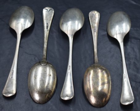 A group of five George V silver Old English pattern serving spoons, marks for Sheffield 1926, maker Mappin & Webb Ltd, 398g