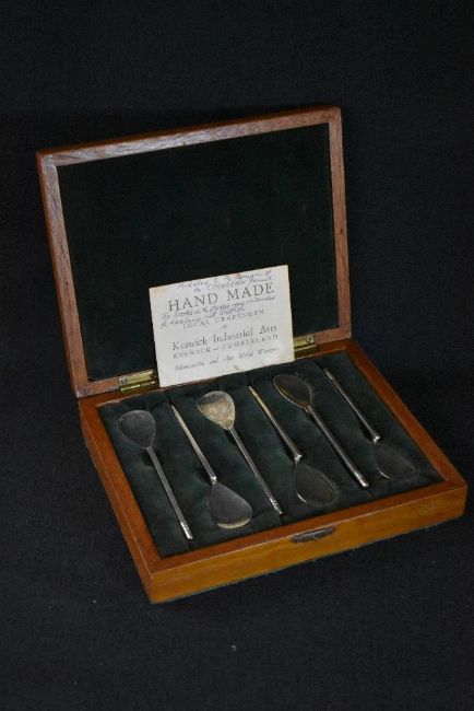 A cased set of Elizabeth II silver Keswick School of Industrial Arts teaspoons, having flattened bowls, squared handled and rounded terminals with line engraving, marks for Edinburgh 1962, 68g gross