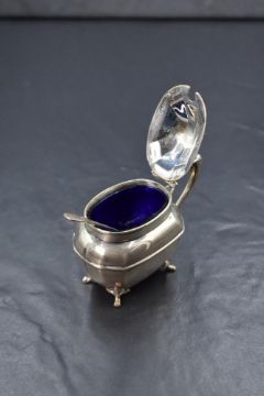 A late Edwardian silver mustard, of oval form having a canted body, raised on four scroll feet, with blue glass liner and spoon, marks for Sheffield 1909, maker Walker & Hall, along with a silver 'Whisky' decanter label with scroll and shell decoration and a white metal 800. grade boat ornament on a rosewood stand, 91g