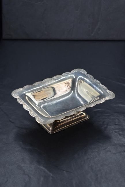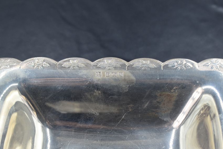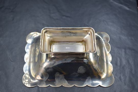 An Elizabeth II silver pedestal bonbon dish, of rectangular form having a lobed rim with floral decoration, raised on a rectangular moulded foot, marks for Birmingham 1972, maker Barker Ellis Silver Co, 6cm H x 16cm diameter 162g