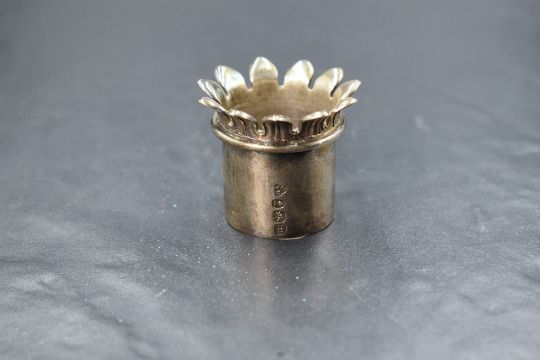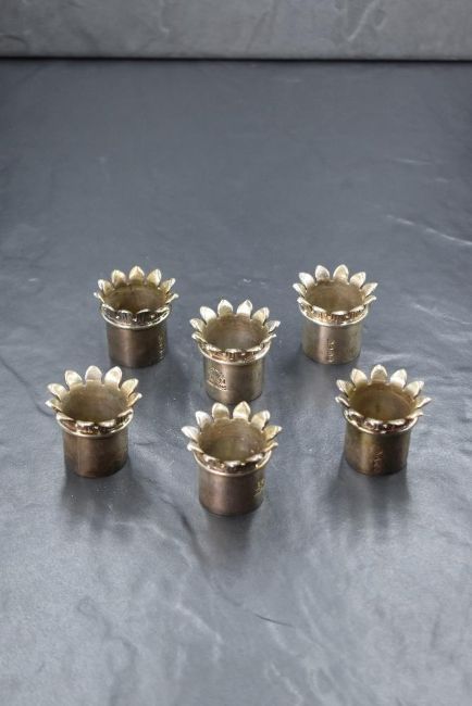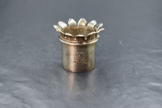 A set of six George IV silver serviette holders, of circular form having flared floral decoration to one end and a castle heraldic crest to the body, marks for London 1827, maker Rundell, Bridge & Rundell, 178g gross