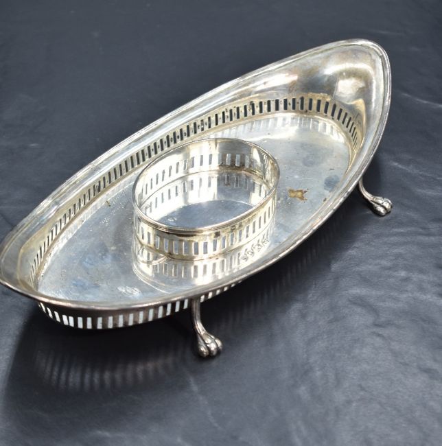 An Edwardian silver desk stand, of elliptical form having pierced walls with a central oval stand also having pierced walls, and a personalised engraving to the base, raised on four claw feet, marks for Birmingham 1904, maker J Sherwood & Sons, 27cm x 11.5cm, 244g