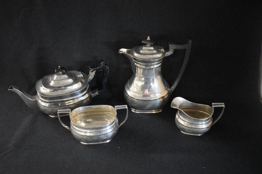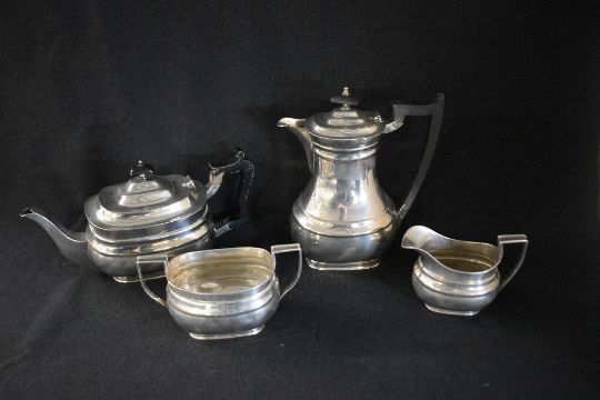 A George V silver four piece tea set, comprising coffee, tea, sugar and cream, of bulbous oval form having angular handles and moulding to the bodies, raised on oval feet, marks for Sheffield 1925, 1926, 1927, maker William Hutton & Sons Ltd, 1800g gross