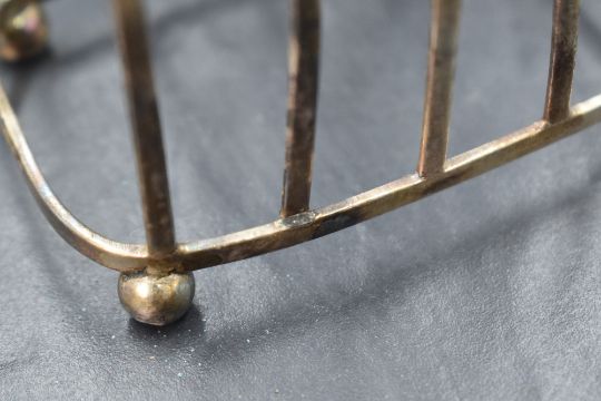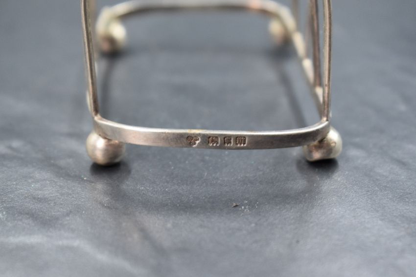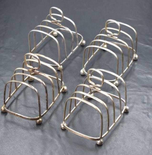 A set of four George V silver toast racks, of rectangular form having four ball feet, marks for London 1927, maker Harrods Ltd, 269g gross. One is broken/damaged