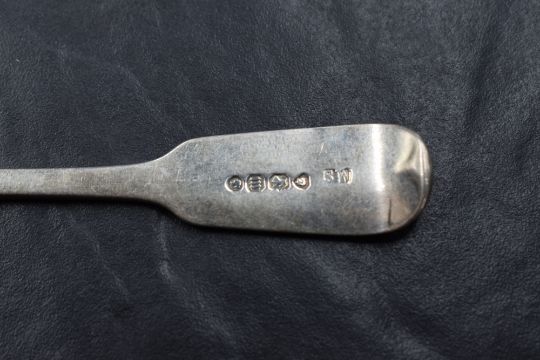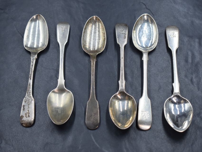 A group of three Victorian silver fiddle pattern teaspoons, having heraldic crests to terminals, marks for London 1867, maker Samuel Whitford, along with a group of three William IV silver fiddle pattern teaspoons, having 'P' initial to terminals, marks for Exeter 1830, maker William Sweet, 137g gross