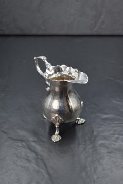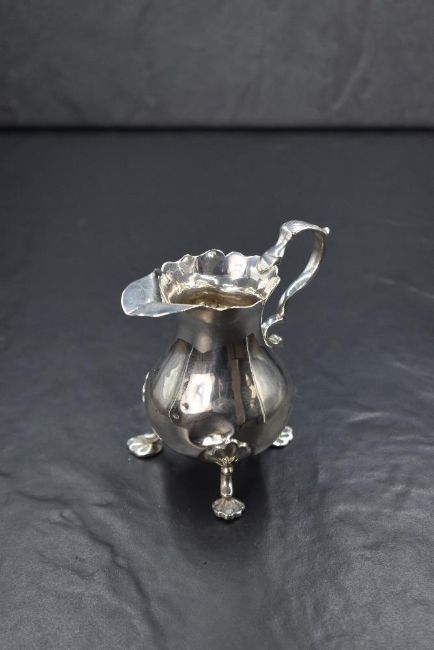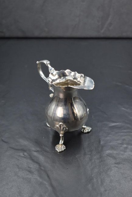 A Georgian silver cream jug, of bulbous form having a Chippendale style rim with generous spout opposed by a scroll handle, raised on three cabriole style legs, rubbed hallmarks, 95g