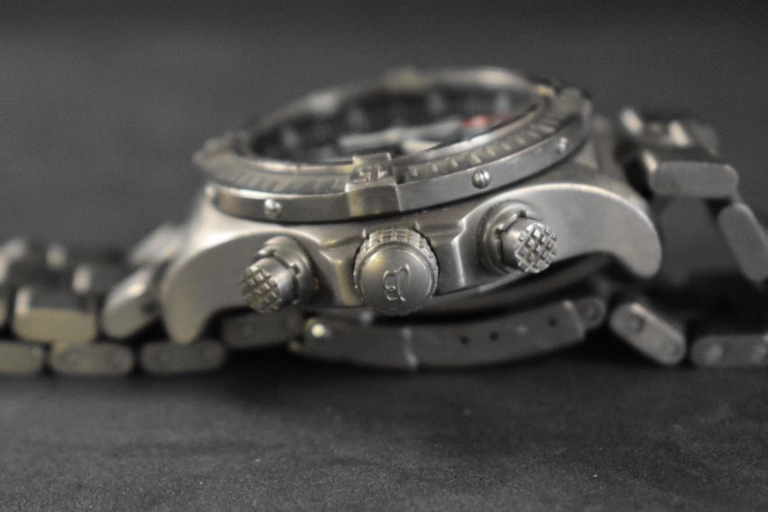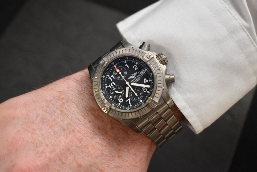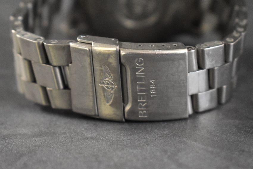 A Breitling Chronograph Avenger chronometer wristwatch, the black dial having Arabic numerals, three subsidiary dials and date aperture at three, numbered E13360 2187277, on a stainless steel bracelet strap numbered T4106, in original case and display box with documents and extra link. Some wear to the outer box