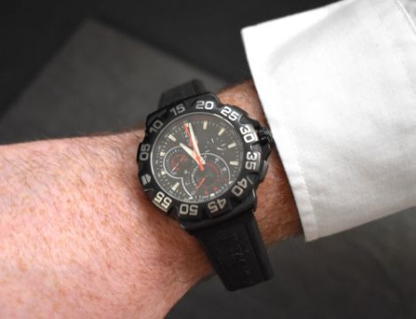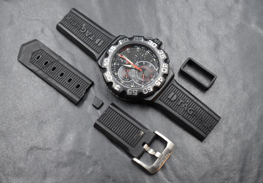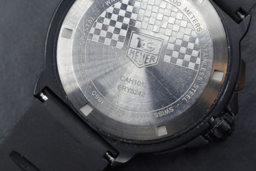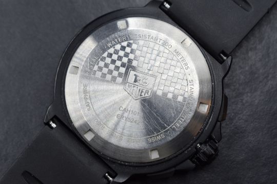 A TAG Heuer Formula 1 Quartz Chronograph Big Date 44 Titanium wristwatch, the black dial having baton numerals, three subsidiary dials and date aperture at twelve, numbered CAH1012 ERY52 on a broken silicon TAG strap in original box with documents
