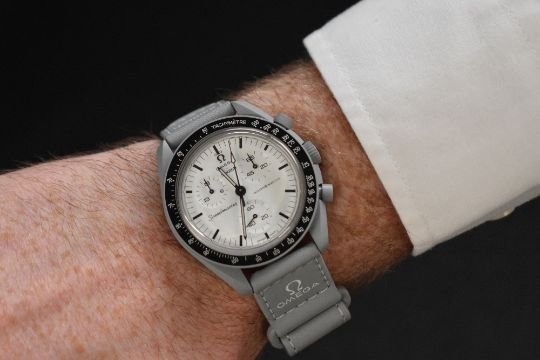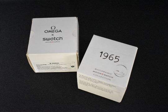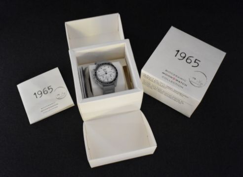 An Omega x Swatch Speedmaster Moonswatch, Mission to the Moonphase 1965 wristwatch, the white dial having baton numerals and three subsidiary dials, under UV light the numbers 19, 65 and 65 are luminous, within a grey Bioceramic case, reverse marked 'Mission to The Moon' having a moon image on the battery cover, on original velcro strap within original box with document, appears unused