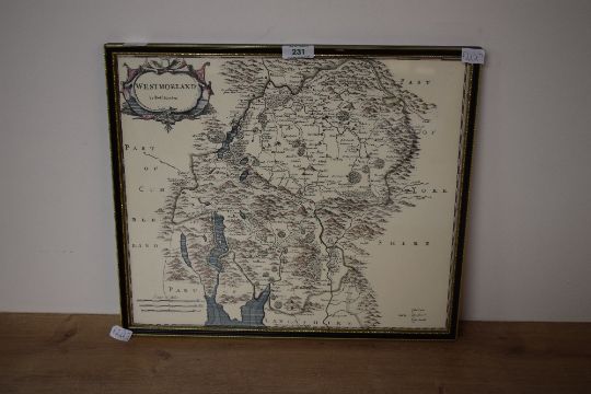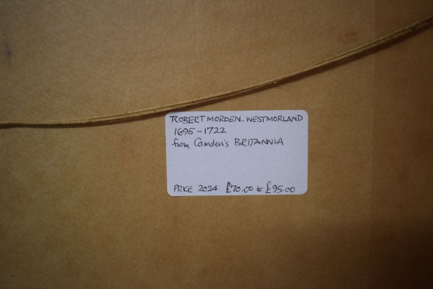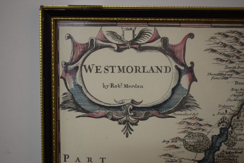 *Local Interest* After Robert Morden (British 1650 - 1703) partially colourised map depicting the historic county of Westmorland, verso states 'Robert Mordern - Westmorland 1695-1722 from Camden's Britannia' within moulded frame, under glass, 40cm x 35cm & 42.5cm x 37cm overall.