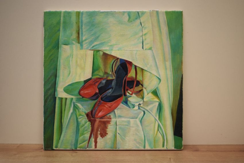 Contemporary oil on canvas, an intriguing study of red shoes with a red wine stain and a plug on a green background, unsigned or attributed, 51cm x 50cm overall.