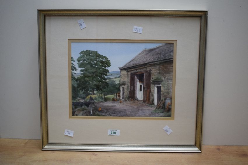 Valerie Wright (British Contemporary) Watercolour 'The Old Barn, Wayho (Thurton-Entwistle), a farmyard scene with chickens, signed and dated (1986) lower right, entitled and artist biography verso, within stepped card mount and moulded gilt frame, under glass 29cm x 22cm & 41cm x 48cm overall.