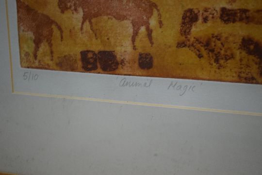 After Barbara Cropper (British Contemporary) Colourised Etching 'Animal Magic' featuring a selection of African safari animals, signed in pencil to lower right margin, titled centre and numbered (5/10) to left, titled and attributed verso, within card mount and moulded frame, under glass 41cm x 32cm & 62cm x 54cm overall.