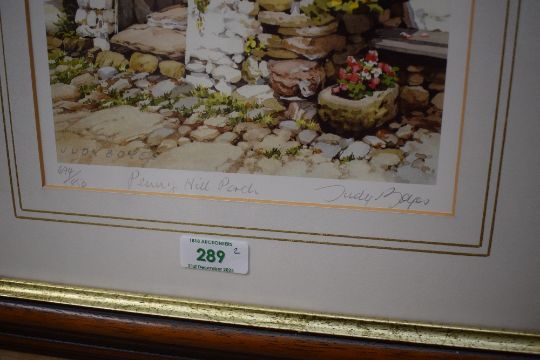 *Local Interest* After Judy Boyes (British 1943) Lithograph 'Village Shop, Eskdale' featuring cats lounging on a bench outside the shop front, signed in pencil to lower right margin, entitled centre and numbered (700/850) to left, certificate of authenticity verso, within washline card mount and moulded frame, under glass 20.5cm x 27.5cm & 40cm x 48cm overall. Sold alongside a second print by the same artist 'Penny Hill Porch' signed entitled and numbered (694/850) with certificate of authenticity verso.
