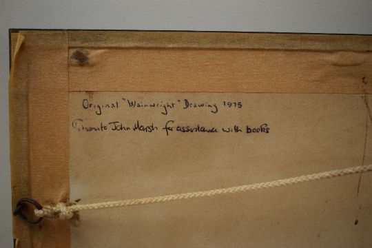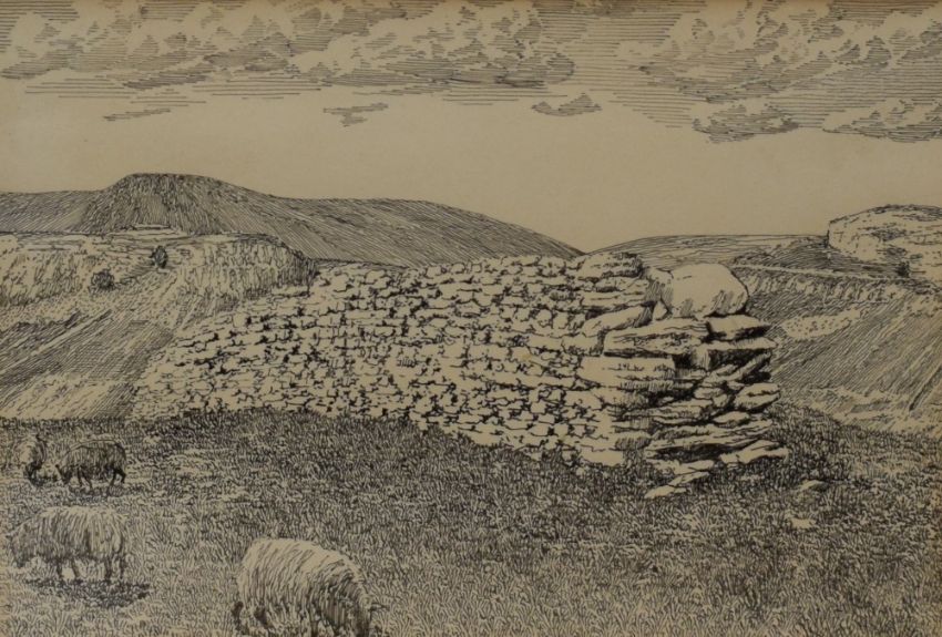 *Local Interest* Alfred Wainwright (British 1907 - 1991) Original pen and ink sketch 'The Celtic Wall' depicting sheep grazing beside the limestone wall of North Yorkshire with Ingleborough Simon's Fell and Smearsett Scar in the background, signed and titled to mount, verso reads 'Original Wainwright Drawing 1975' alongside gift note to previous owner, within card mount and moulded frame, under glass 17.5cm x 12.5cm & 29.5cm x 26.5cm overall. *A variation of this drawing is included in 'Walks in Limestone Country' by Alfred Wainwright, Walk 18 'The Celtic Wall and Smearsett Scar' section 3. Whilst it is not the final drawing featured in the book it is likely to have been a variation created around the same time.