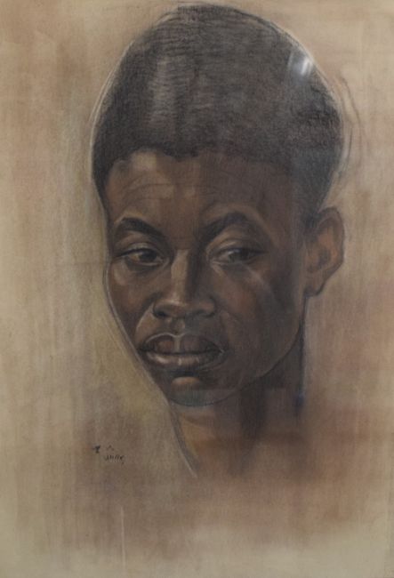20th Century charcoal / pastel portrait depicting a Congolese man, signed indistinctively to lower left, label in French verso appears to provide further information on the subject and also confirms this was created before the independence of Congo during the period of the Territory of Belgian Congo placing its age somewhere between 1908 - 1960, within card mount and moulded wooden frame, under glass 35cm x 51cm & 48.5cm x 67cm overall.