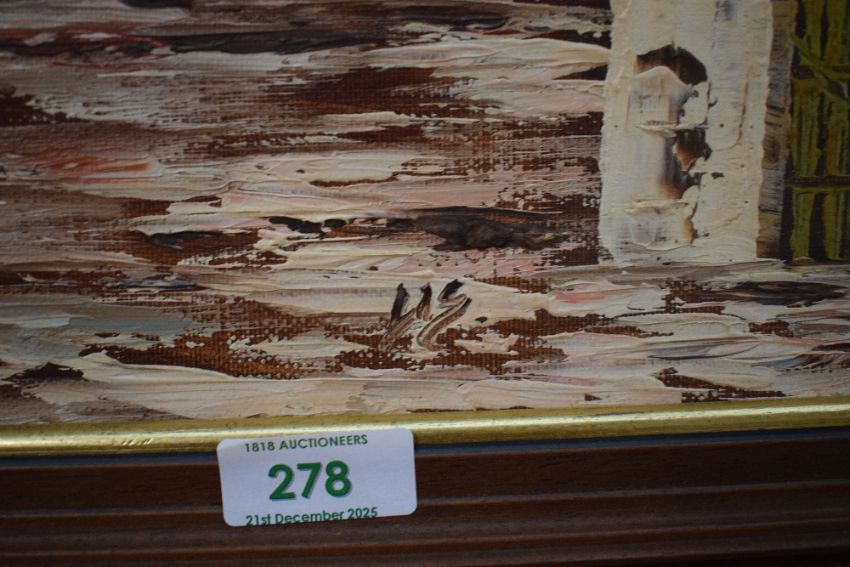 A 20th century continental impasto oil on canvas, street scene, initialled 'HS' lower centre, within moulded frame, 31.5cm x 40cm & 37cm x 45cm overall.