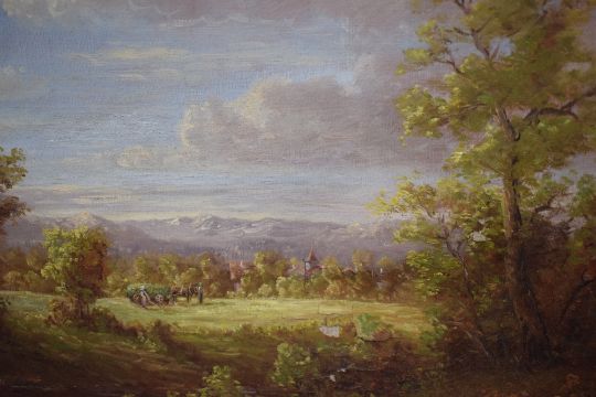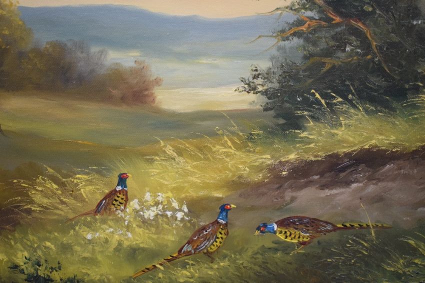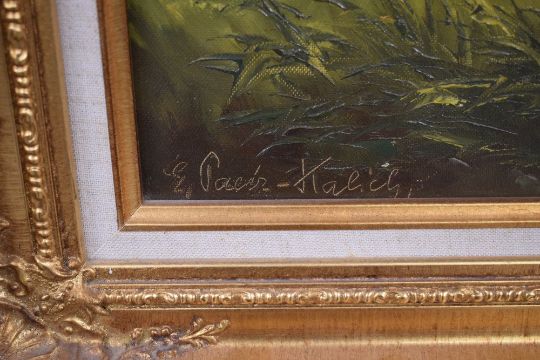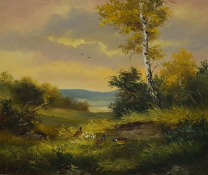 H Kalich (Austrian 19th Century) oil on canvas, a countryside landscape in warm tones featuring pheasants, signed lower left, artists biography verso, within canvas slip and moulded gilt frame, 60cm x 49cm & 74cm & 64cm overall. Sold alongside a second agricultural oil on canvas landscape, signed indistinctively lower right, within moulded gilt frame 39cm x 49cm overall. Smaller canvas has lost tension and has some cracking to paint.