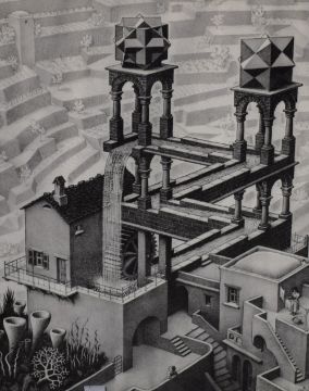 Maurits Cornelis Escher (Dutch 1898 - 1972) Lithograph 'Waterfall', a monochromatic surrealist composition depicting the perpetual motion machine, printed in Holland by Van Dooren B.V Vlaardingen, additional printing details verso, within thin metal frame, under glass 49cm x 59cm & 50cm x 60cm overall.