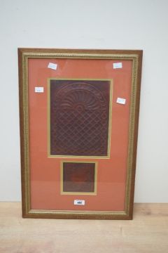After Judy Roberts (UAE Contemporary) Hand coloured etching 'Arabesque tiles', Arabic pattern inspired tiles in a deep red, titled and attributed verso, within multi-aperture card mount and gilt brushed wood frame, under glass 37cm x 19cm & 57cm x 38cm overall.