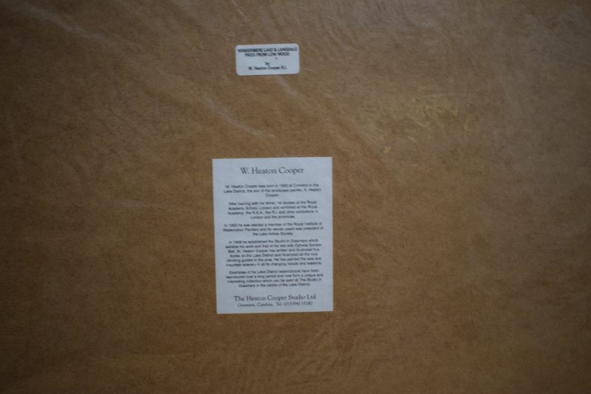 *Local Interest* After William Heaton Cooper (British 1903 - 1995) Lithograph 'Windermere Lake & Langdale Pikes from Low Wood', signature facsimile lower left, entitled and attributed along with artist's biography verso, within card mount, 37cm x 25cm & 51cm x 40.5cm overall. Sold alongside a second lithograph by the same artist 'Elterwater', within card washline mount and moulded gilt frame, under glass, 24cm x 18cm & 38cm x 32.5cm overall. Also sold with after Alfred Heaton Cooper (British 1863 - 1929) Lithograph 'Rydal Water and Nab Cottage', within card mount and a second lithograph by the same artist 'Wild Daffodils, Ullswater', within card mount and flat white frame.