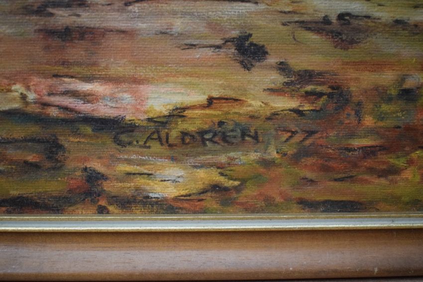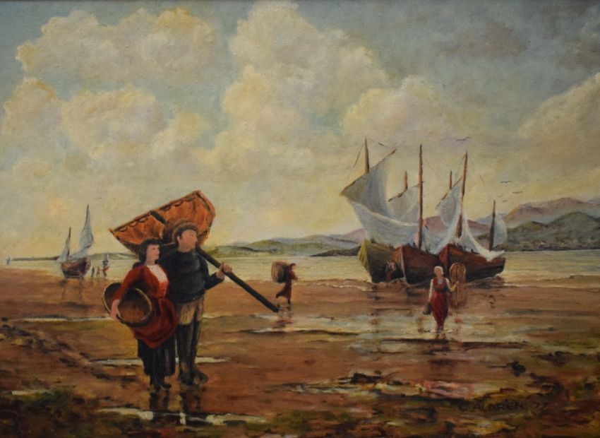 C Aldren (British 20th Century) oil on canvas, costal scene depicting fishermen with nets, signed and dated (1977) lower right, within moulded frame, 55cm x 40cm & 60cm x 44cm overall.