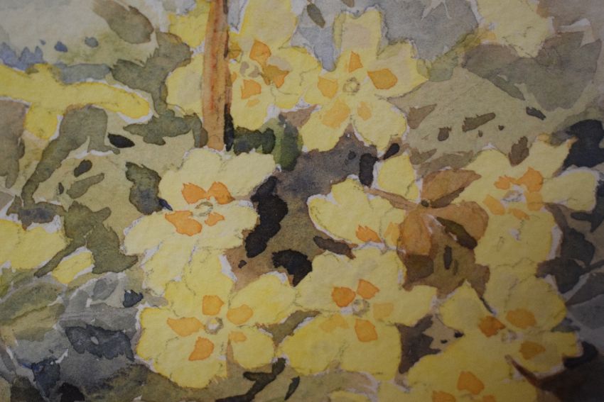 *Local Interest* Henry W Bracken (British 1920 - 1998) Watercolour, a study of a group of wild primroses, initialled lower left, within washline card mount and moulded frame, under glass 17.5cm x 11.5cm & 29cm x 25cm overall.
