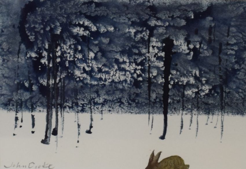 *Local Interest* John Cooke (British 1929 - 2018) watercolour, a rabbit under a tree canopy, signed in pencil lower left, within card mount and moulded gilt frame, under glass 17cm x 12cm & 28cm x 24cm overall.
