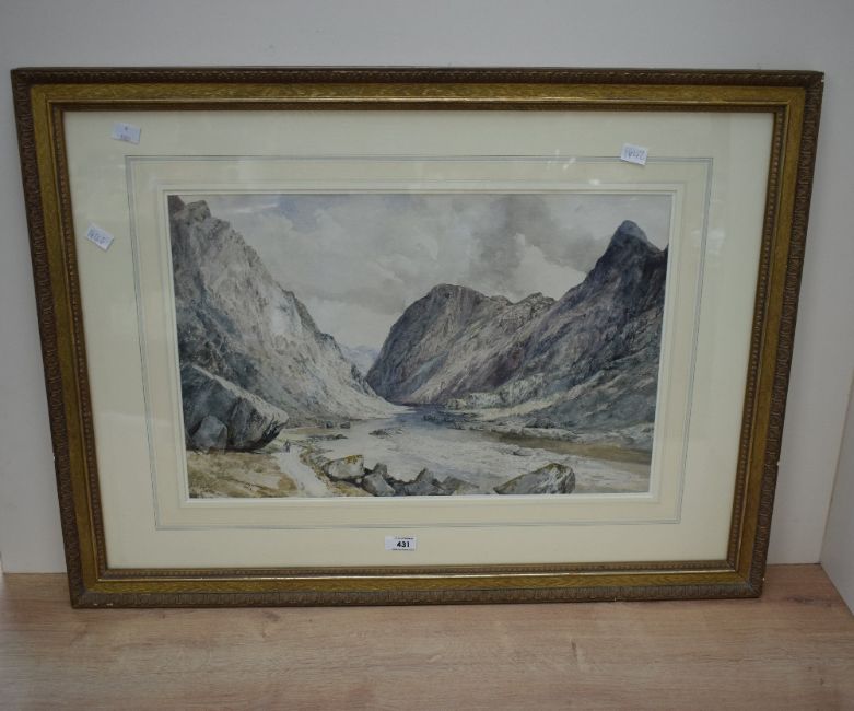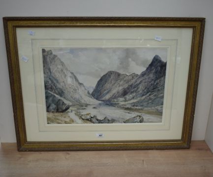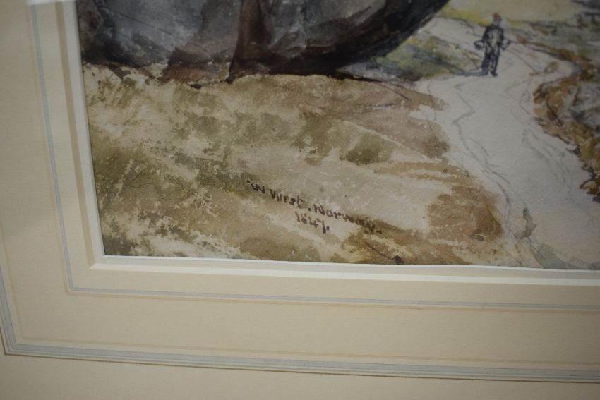William West (British 1801 - 1861) English School Watercolour 'Norway', mountainous river scene with lone figure, signed titled and dated (1847) lower left, within stepped washline mount and moulded gilt frame, under glass 51cm x 33.5cm & 80cm x 59.5cm overall.