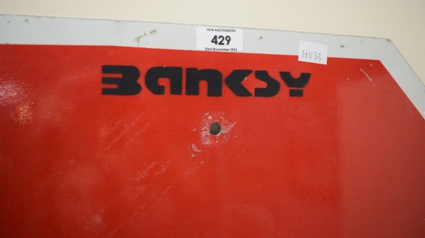 An interesting unauthorised 'BanksyLand' Banksy Retrospective American stop sign, (painted metal with American O) of octagonal form featuring an anthropomorphic rodent 77cm *An unauthorized retrospective of the work by Banksy opened in Philadelphia’s Germantown neighbourhood in 2022 BanksyLand was an unauthorized traveling exhibition put on by One Thousand Ways, a Portland, Oregon-based company with no direct ties to the artist. The company founders made Banksy aware of the exhibition through his legal representation, the exhibition wasn't endorsed by the artist or prohibited.