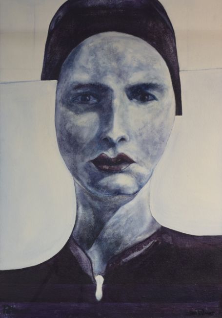 James Palmer (contemporary) Acrylic on board 'Homage to Herb Ritze' an expressionistic portrait of a woman in cool tones, signed lower left, counter signed and entitled verso, within moulded frame, 67cm x 95cm & 82cm x 110cm overall.