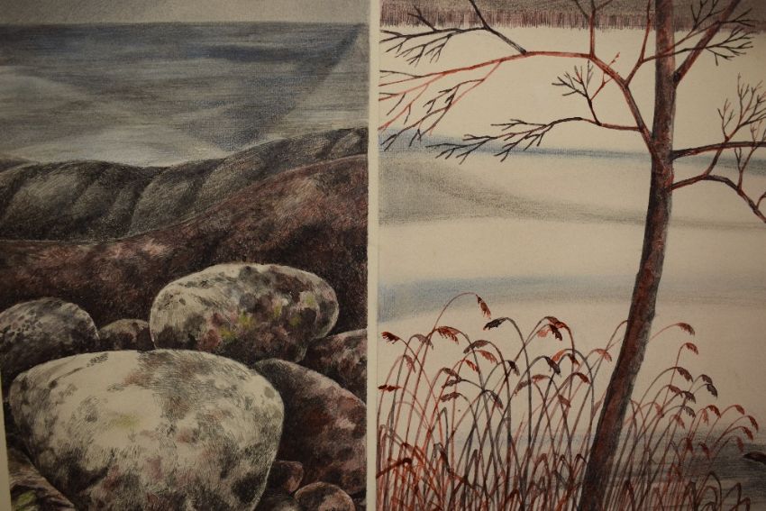 Chris White (20th Century) Watercolour and ink, triptych lake scene in cool tones, signed and dated (1982) lower right, 62cm x 32cm overall.