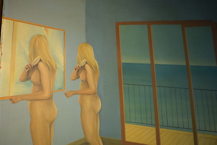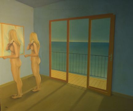 Colin Scott (British 1941-2006) Surrealist oil on canvas, a nude female is repeated brushing her hair in a mirror beside a balcony overlooking the sea, initialled CS and dated 1974 lower left, within metal slip and wooden frame, 104cm x 87cm & 110cm x 94cm overall.